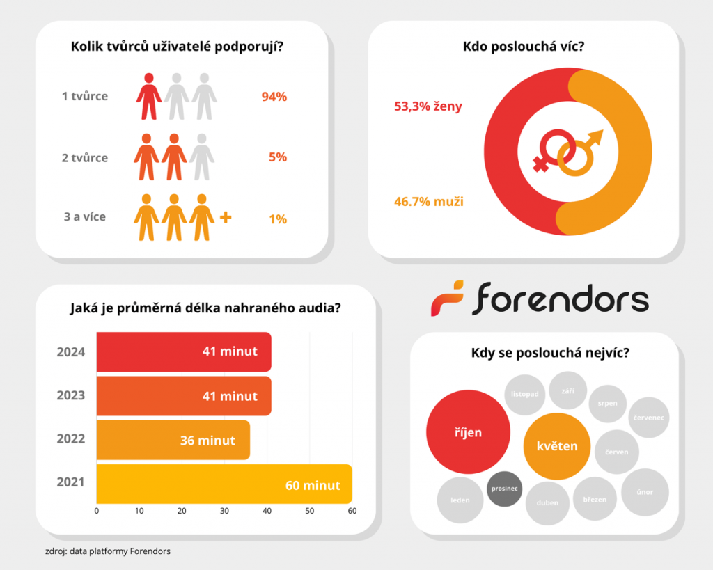 Zaostříme si na podcasty, protože audiovizuální obsah je v tuhle chvíli mezi podporovateli nejoblíbenějším formátem. Lidé u něj tráví v průměru 12 h měsíčně (přesněji 777 minut). V poslechu podcastů vedou o něco málo ženy (53 %), i když ani muži (47 %) nezůstávají pozadu. Zajímavá jsou také čísla ukazující průměrnou délku audiovizuálního obsahu. Zatímco v roce 2021 byla průměrná délka jednoho příspěvku 60 minut, v roce 2022 klesla téměř na polovinu (36 minut). Od roku 2023 se délka ustálila na 41 minutách.